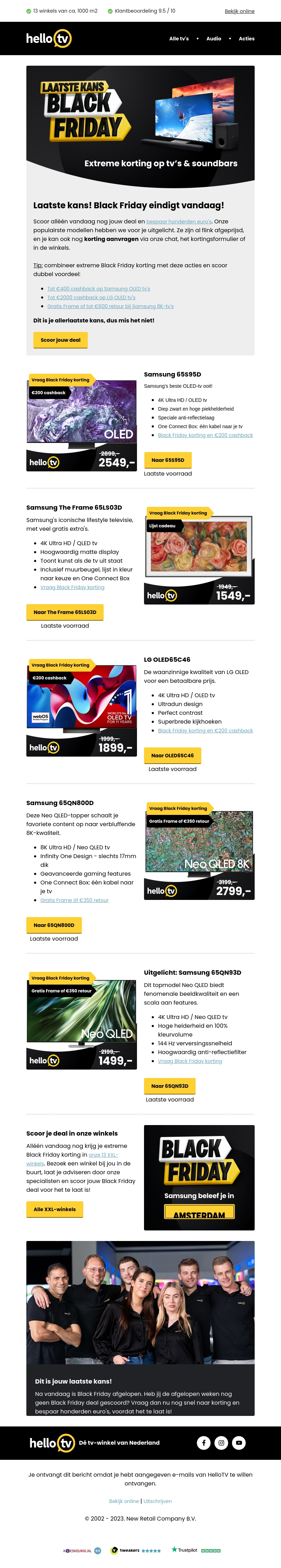 Dit is je laatste kans om te profiteren van de extreme Black Friday kortingen bij HelloTV. Ontvang tot wel honderden euro's korting op geselecteerde tv's en soundbars. Het aanbod geldt alleen vandaag, dus wees er snel bij. Bezoek een van onze winkels of shop online. Ontdek nu je favoriete merken en modellen met geweldige kortingen.
