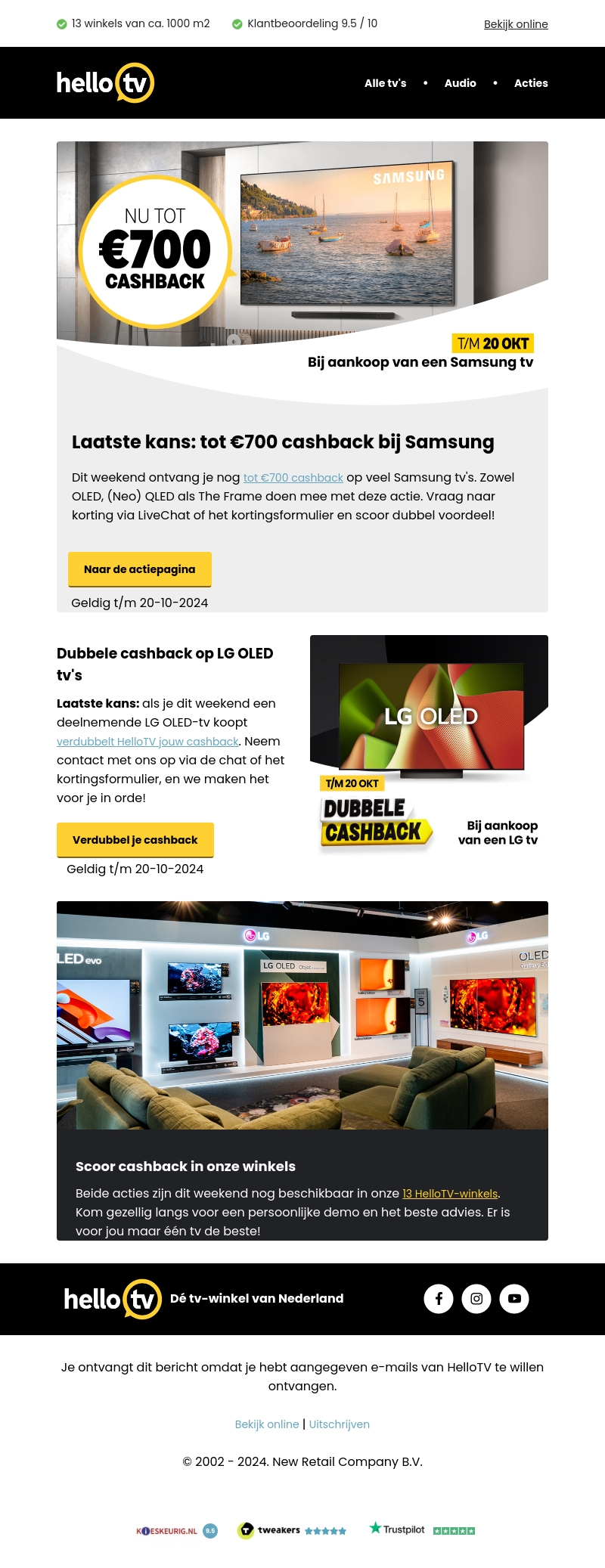 Mis deze kans niet om tot €700 cashback te ontvangen op geselecteerde Samsung TV's, waaronder OLED en QLED. Deze actie is geldig tot en met 20 oktober 2024. Bezoek HelloTV voor dubbel voordeel via chat of kortingsformulier. Verlies geen tijd en scoor een geweldige deal voor jouw ideale TV.