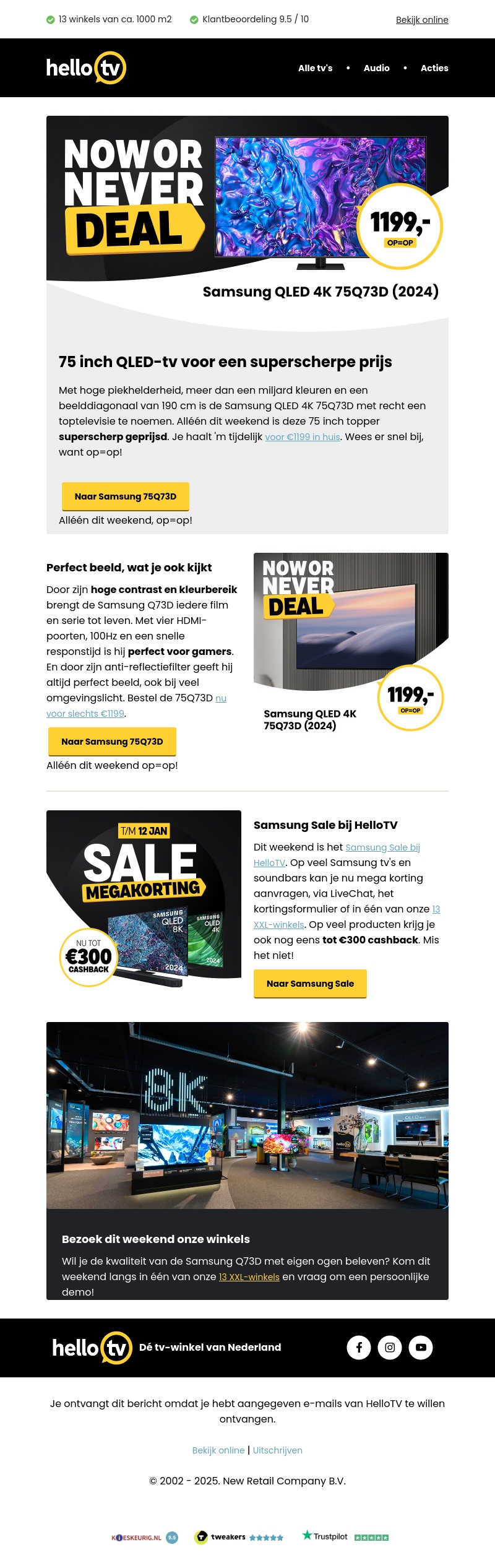 Mis deze unieke kans niet om de Samsung QLED 4K 75Q73D in huis te halen voor slechts €1199. Met zijn uitmuntende beeldkwaliteit, hoge contrast en kleurweergave is deze televisie ideaal voor films en gaming. Geniet ook van de Samsung Sale bij HelloTV met kortingen en cashback aanbiedingen tot €300. Alleen dit weekend, dus wees er snel bij!