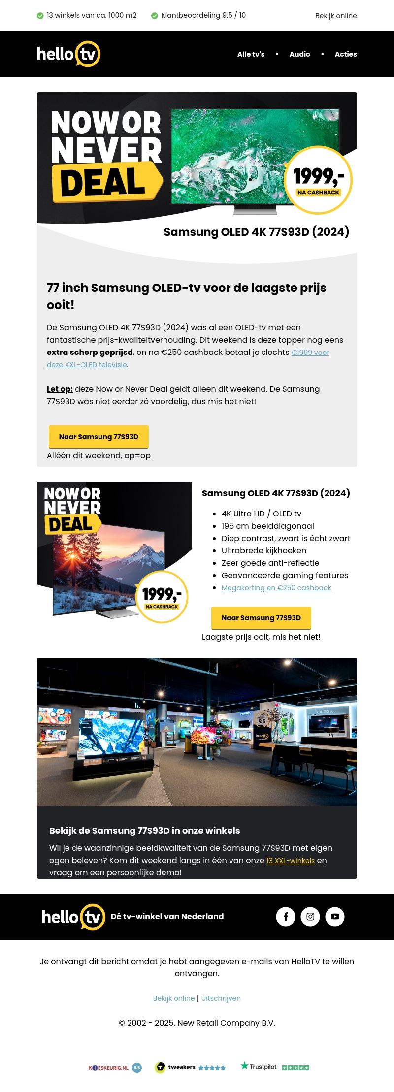 De Samsung OLED 4K 77S93D (2024) tv biedt uitstekende beeldkwaliteit voor een superscherpe prijs. Alleen dit weekend profiteer je van €250 cashback, waardoor de tv slechts €1999,- kost. Mis deze unieke kans niet tijdens de Now or Never Deal. Bezoek onze winkels voor een persoonlijke demo en ervaar zelf de uitzonderlijke visuele prestaties.