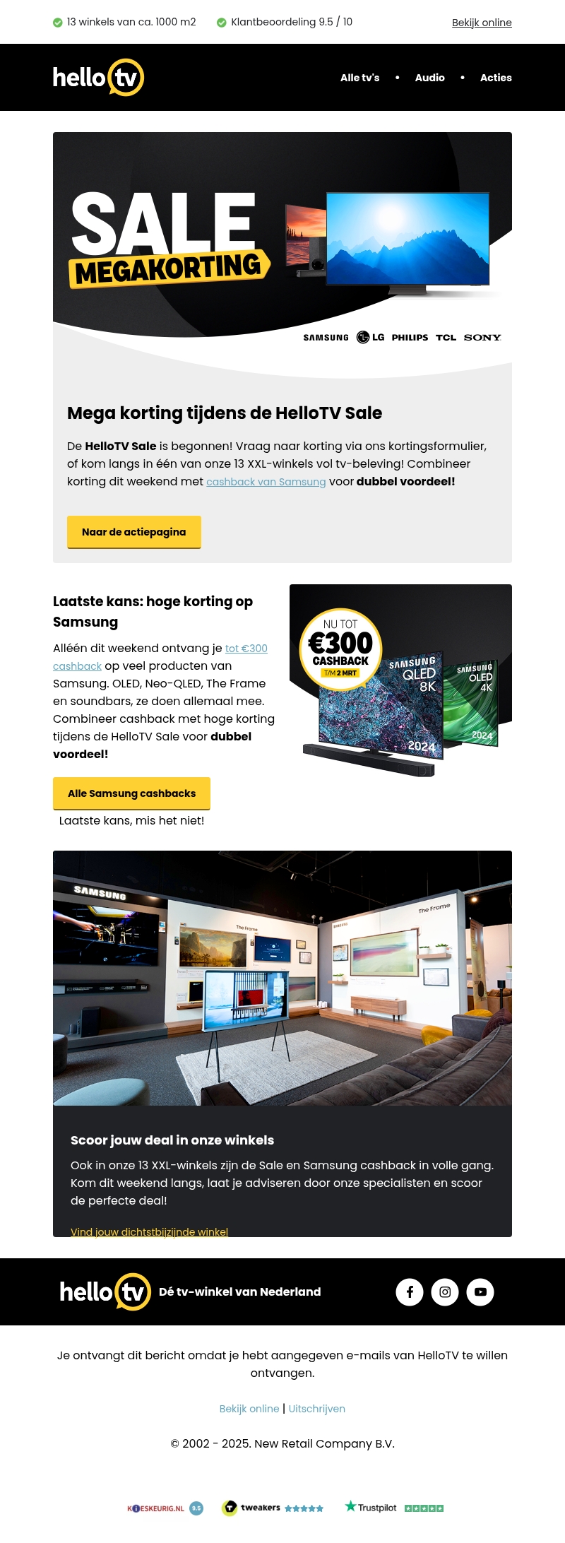 De HelloTV Sale biedt enorme kortingen op TV's en soundbars. Ontdek aanbiedingen van topmerken zoals Samsung en ontvang tot €300 cashback. Bezoek een van onze 13 XXL-winkels of shop online voor de ultieme TV-ervaring. Mis deze kans niet en scoor jouw deal dit weekend!