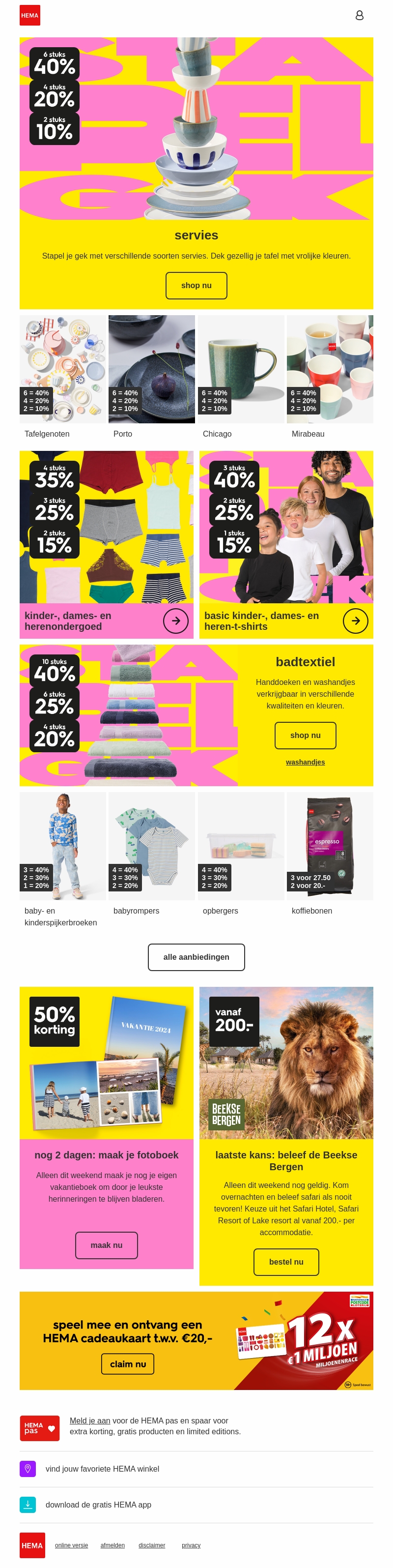 Ontdek de stapelgekke aanbiedingen van dit weekend bij HEMA. Profiteer van kortingen tot 50% op diverse producten, zoals servies, kleding, badtextiel en meer. Mis het niet, deze kortingen zijn alleen dit weekend geldig!