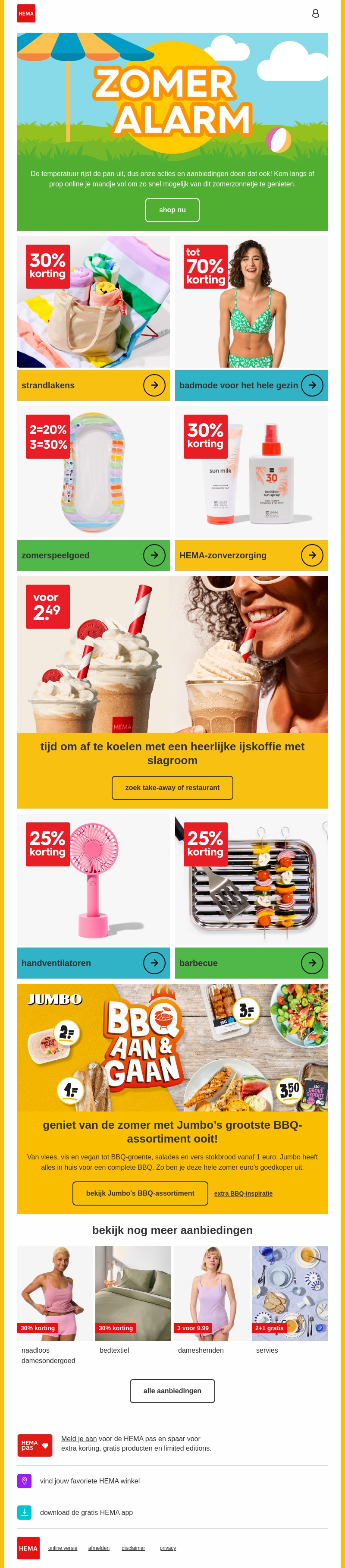 Het is tijd om te genieten van de zomer met geweldige kortingen. Shop prachtige strandlakens, zomerspeelgoed, zonnebrandcrème, handventilatoren, en meer. Mis ook de heerlijke ijskoffie en fantastische BBQ-aanbiedingen niet. Alles wat je nodig hebt voor een perfecte zomer, vind je nu bij HEMA en Jumbo.
