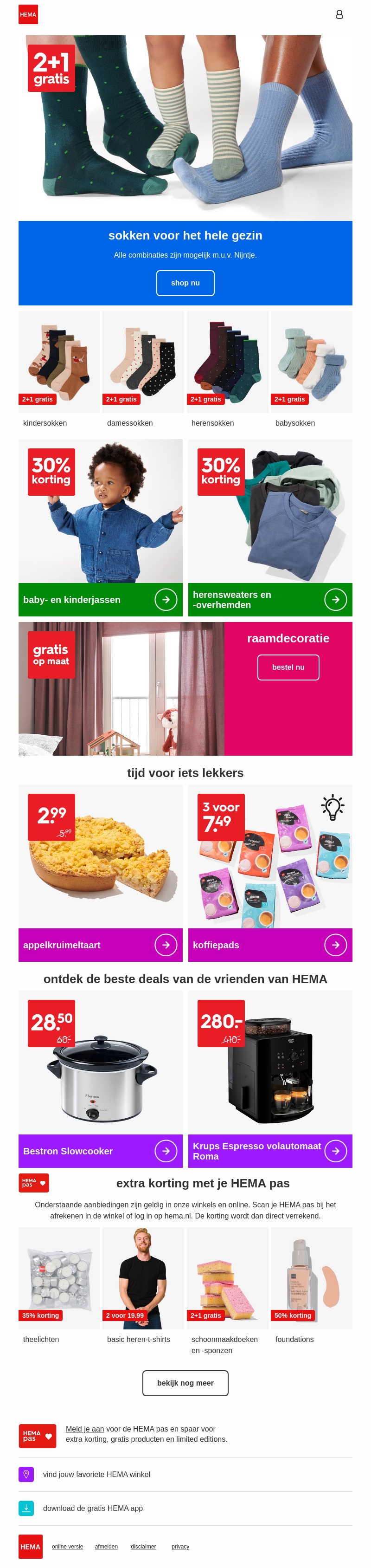 HEMA biedt nu een geweldige actie: 2+1 gratis op sokken voor het hele gezin. Van kindersokken tot herensokken, er is voor ieder wat wils. Daarnaast zijn er ook speciale kortingen op kinderkleding, herenkleding en meer. Mis deze kans niet om je garderobe op te frissen met nieuwe kleuren en prints.
