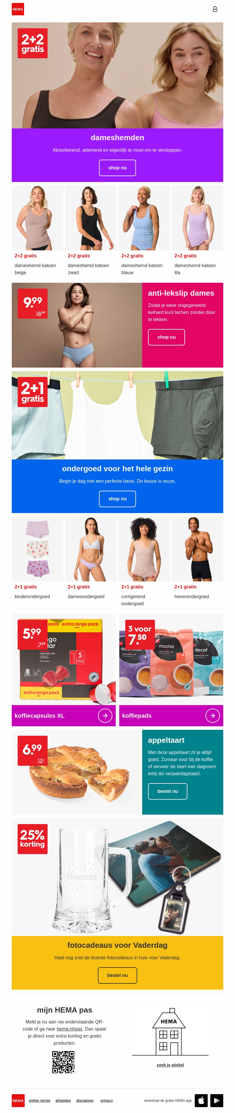 Ontvang 2+2 gratis op dameshemden bij HEMA. Absorberend, ademend en te mooi om te verstoppen. Daarnaast zijn er aanbiedingen op anti-lekslips, ondergoed voor het hele gezin, en meer. Shop nu en bespaar op je favoriete producten.