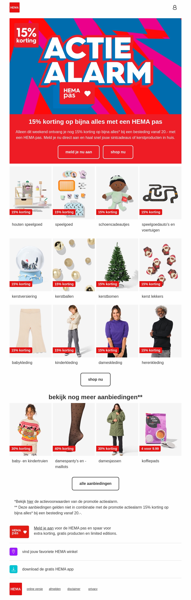 Alleen dit weekend krijg je 15% korting op bijna het gehele assortiment bij HEMA met een minimale besteding van 20 euro. Met jouw HEMA pas profiteer je van exclusieve kortingen, ideaal voor het aanschaffen van sintcadeaus en kerstproducten. Schrijf je in en ontdek het brede scala aan producten, van speelgoed en kleding tot kerstartikelen. Mis deze kans niet om te besparen op jouw favoriete items.
