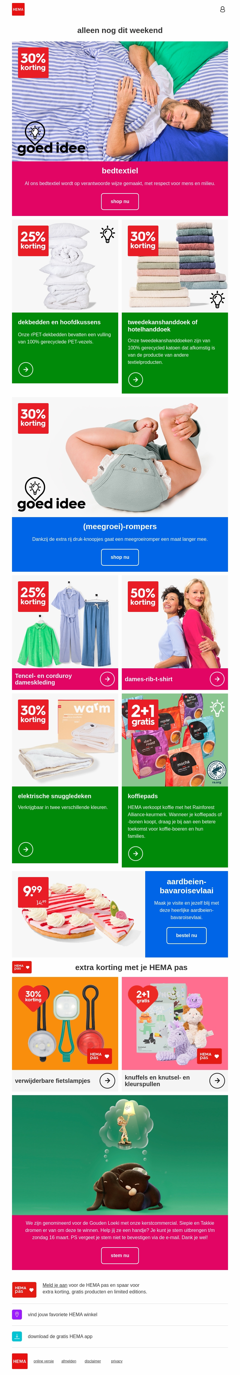 Ontdek dit weekend geweldige aanbiedingen bij HEMA. Geniet van 30% korting op bedtextiel en 25% korting op dekbedden en kussens. Ervaar ultiem comfort met onze elektrische snuggiedekens en bespaar meer met de HEMA pas. Mis deze kans niet op geweldige deals!