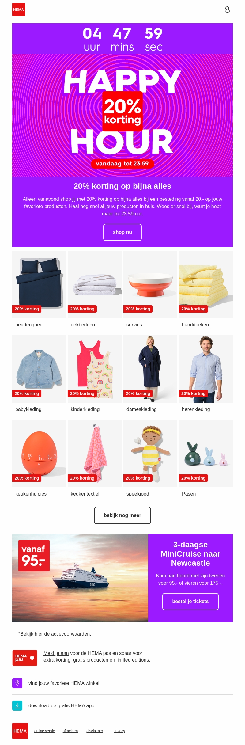 Slechts vanavond biedt HEMA 20% korting op bijna alles. Doe inkopen voor je favoriete items met een minimum besteding van 20 euro. Zorg dat je op tijd bent, de actie eindigt om 23:59 uur. Van beddengoed tot kinderkleding, ontdek ons assortiment. Haal snel je artikelen in huis en geniet van de korting. Vergeet niet de voorwaarden te bekijken.