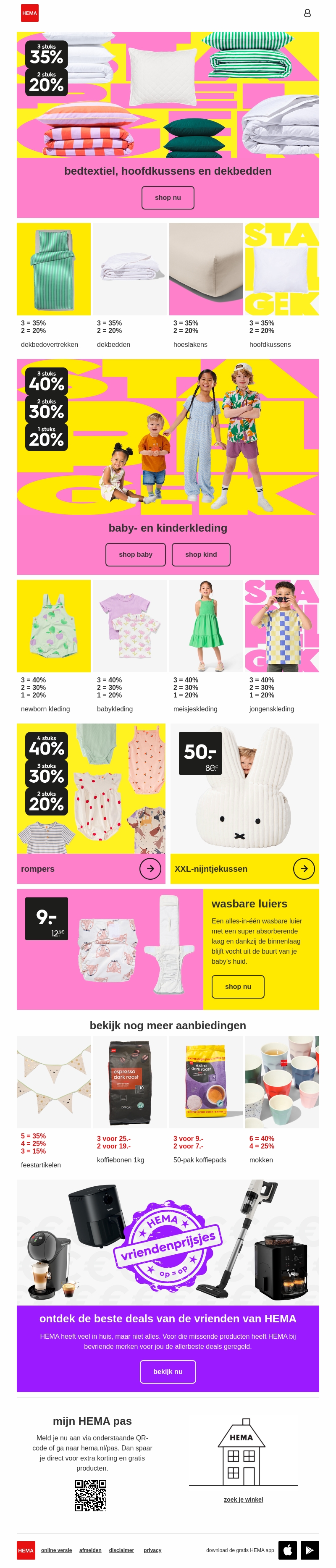 Ontdek de nieuwste aanbiedingen op bedtextiel, hoofdkussens en dekbedden bij HEMA. Nu met kortingen die oplopen naargelang jouw aankopen! Ook voor baby- en kinderkleding zijn er waanzinnige deals. Klik door voor exclusieve vriendenprijzen en meer verrassingen.