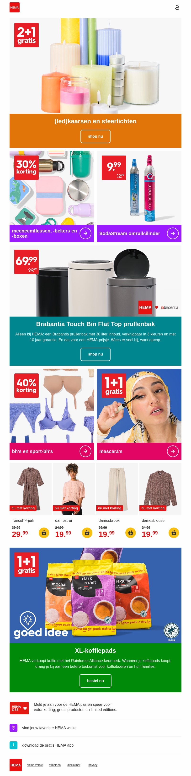 Profiteer van HEMA's nieuwste sale met speciale aanbiedingen op sfeerlichten en LED-kaarsen: 2+1 gratis! Ontdek daarnaast kortingen op meeneemflessen, BH's, en modieuze outfits. Mis de kans niet op de Brabantia prullenbak voor een scherpe prijs. Verwen jezelf met voordelige koffiepads terwijl je bijdraagt aan een duurzame toekomst.
