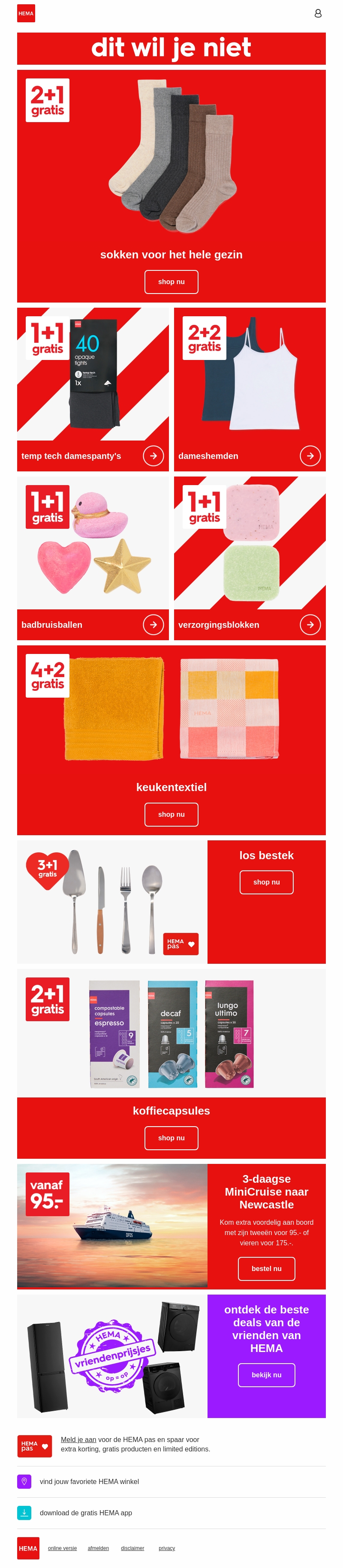 Ontdek de nieuwste aanbieding van HEMA met 2+1 gratis op sokken voor het hele gezin. Profiteer ook van andere geweldige deals zoals 1+1 gratis op verzorgingsblokken en keukentextiel. Beleef extra voordeel met HEMA pas aanbiedingen en mis de kans niet op een MiniCruise naar Newcastle.