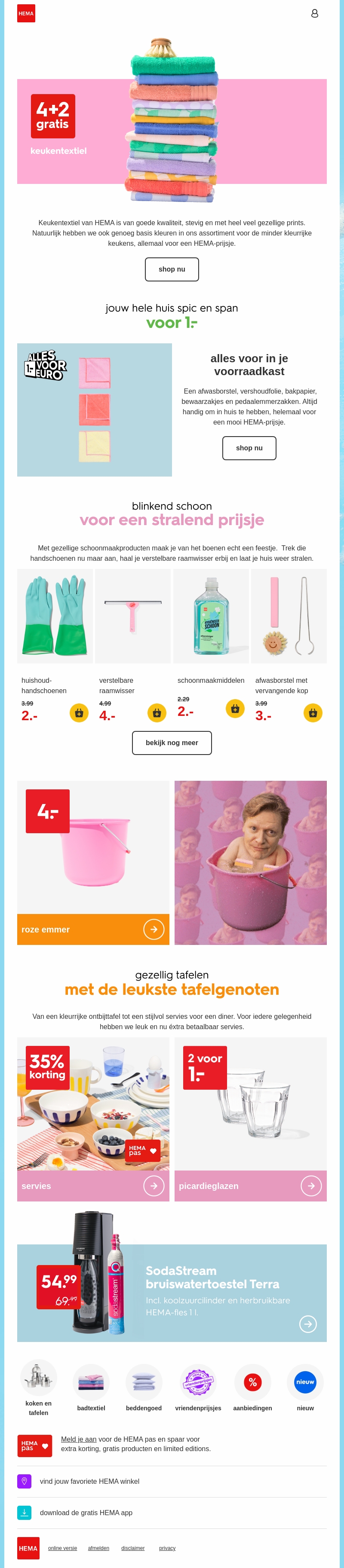 Maak je huis spic en span met HEMA! Ontdek onze aanbiedingen voor keukentextiel, schoonmaakproducten, servies en meer. Profiteer nu van geweldige kortingen. Alles wat je nodig hebt voor een schoon en gezellig huis vind je bij HEMA.