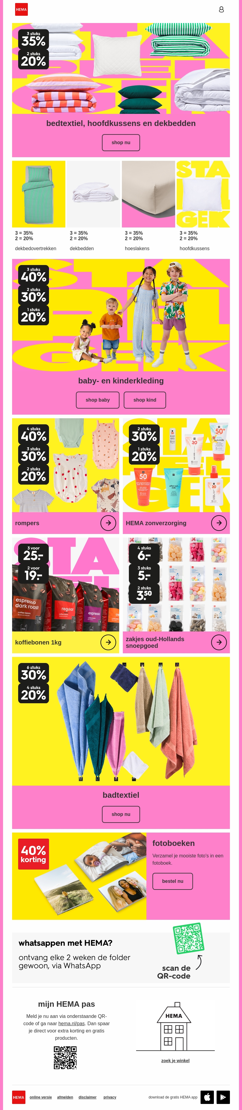 Deze week biedt HEMA geweldige kortingen op een breed scala aan producten. Van bedtextiel en handdoeken tot baby- en kinderkleding, er zijn volop deals te ontdekken. Mis ook niet de speciale aanbiedingen op koffiebonen en zonverzorging!