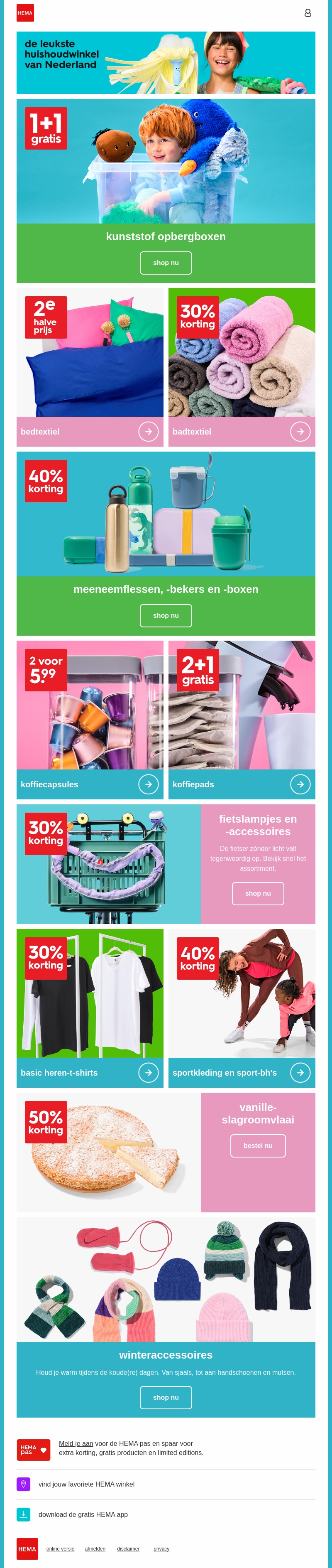 Ontdek de nieuwste aanbiedingen bij HEMA met 1+1 gratis op kunststof opbergboxen. Profiteer van kortingen op diverse artikelen zoals badtextiel, koffiecapsules, en winteraccessoires. Shop nu en maak gebruik van deze exclusieve deals. Vergeet niet extra te sparen met je HEMA pas. Download de HEMA app voor nog meer voordelen.