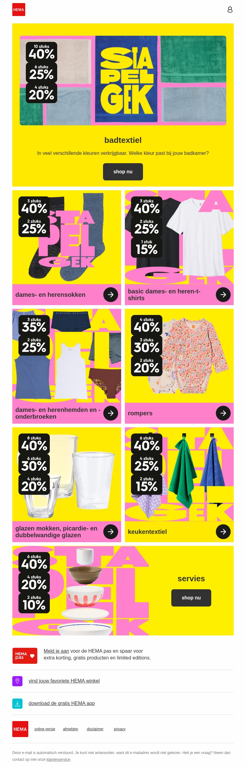 stapel je gek: badtextiel 10 stuks 40%, 6 stuks 25%, 4 stuks 20% korting