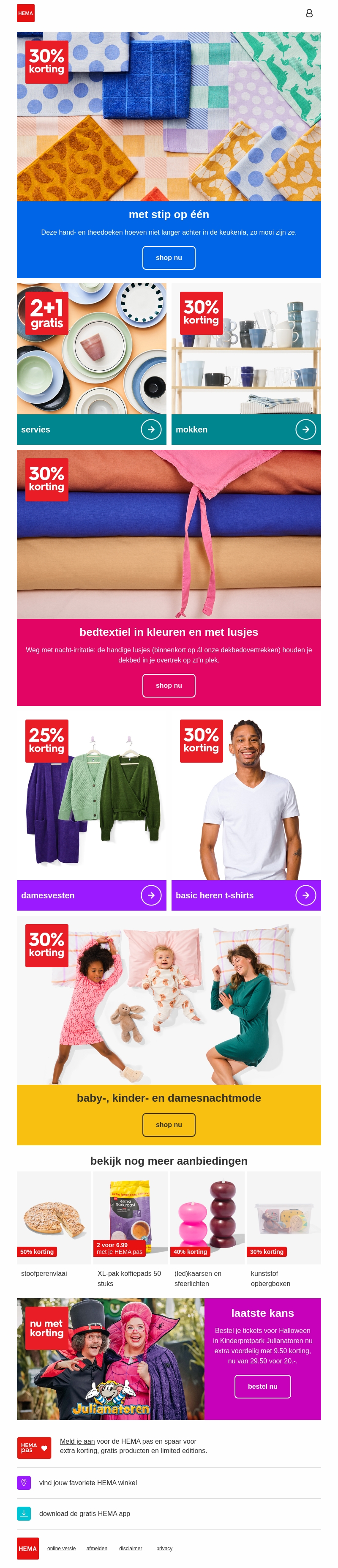 Deze nieuwsbrief biedt geweldige kortingen op diverse huishoudelijke producten. Verwen je keuken met prachtige handdoeken of vernieuw je bed met kleurrijk beddengoed. Profiteer van aanbiedingen op servies en mokken, en ontdek stijlvolle kledingdeals. Ook voor de kleintjes is er slaapmode met korting. Shop nu voor de beste deals en maak je huis nog gezelliger.