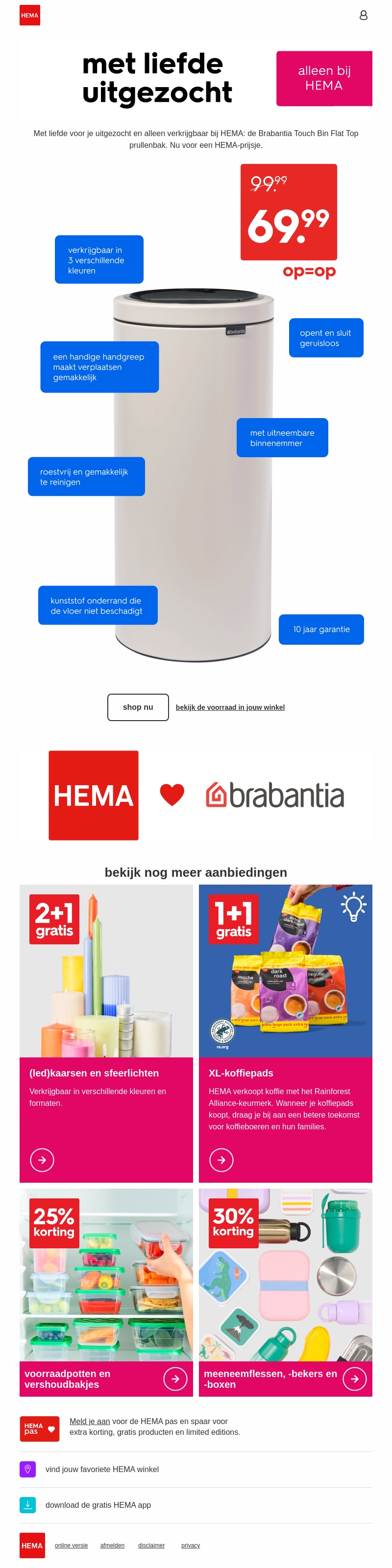 De Brabantia Touch Bin Flat Top prullenbak is met liefde uitgezocht voor jou. Beschikbaar bij HEMA voor een speciale prijs. Deze stijlvolle en functionele prullenbak is verkrijgbaar in drie kleuren en biedt een geruisloze opening. Plus, met een gemakkelijk uitneembare binnenemmer en roestvrij materiaal, wordt schoonmaken een fluitje van een cent.