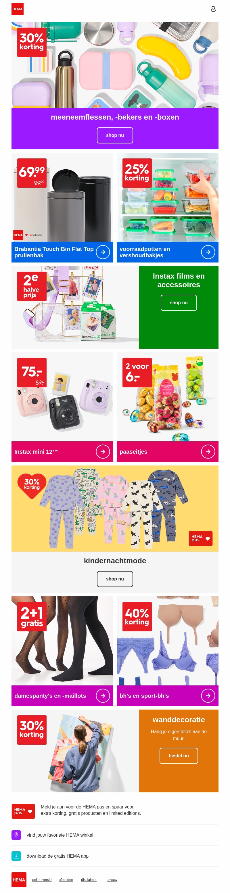 Profiteer nu van 30% korting op meeneemflessen, -bekers en -boxen. Ideaal voor school en kantoor. Daarnaast zijn er nog meer aanbiedingen zoals kortingen op prullenbakken, voorraadpotten, kindernachtmode, en wanddecoraties. Vergeet niet ook te kijken naar speciale deals op Instax camera's en paaseitjes. Shop de beste aanbiedingen nu bij HEMA!