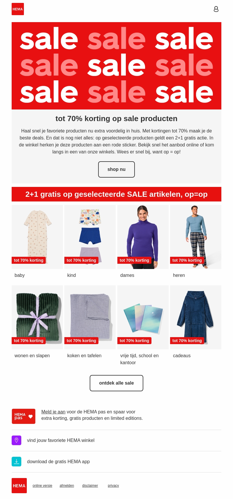 Profiteer van kortingen tot 70% op HEMA sale producten. Haal je favoriete items in huis met geweldige deals. Inclusief een speciale 2+1 gratis actie op geselecteerde producten. Herken deze producten aan de rode sticker. Wees er snel bij, want op=op!