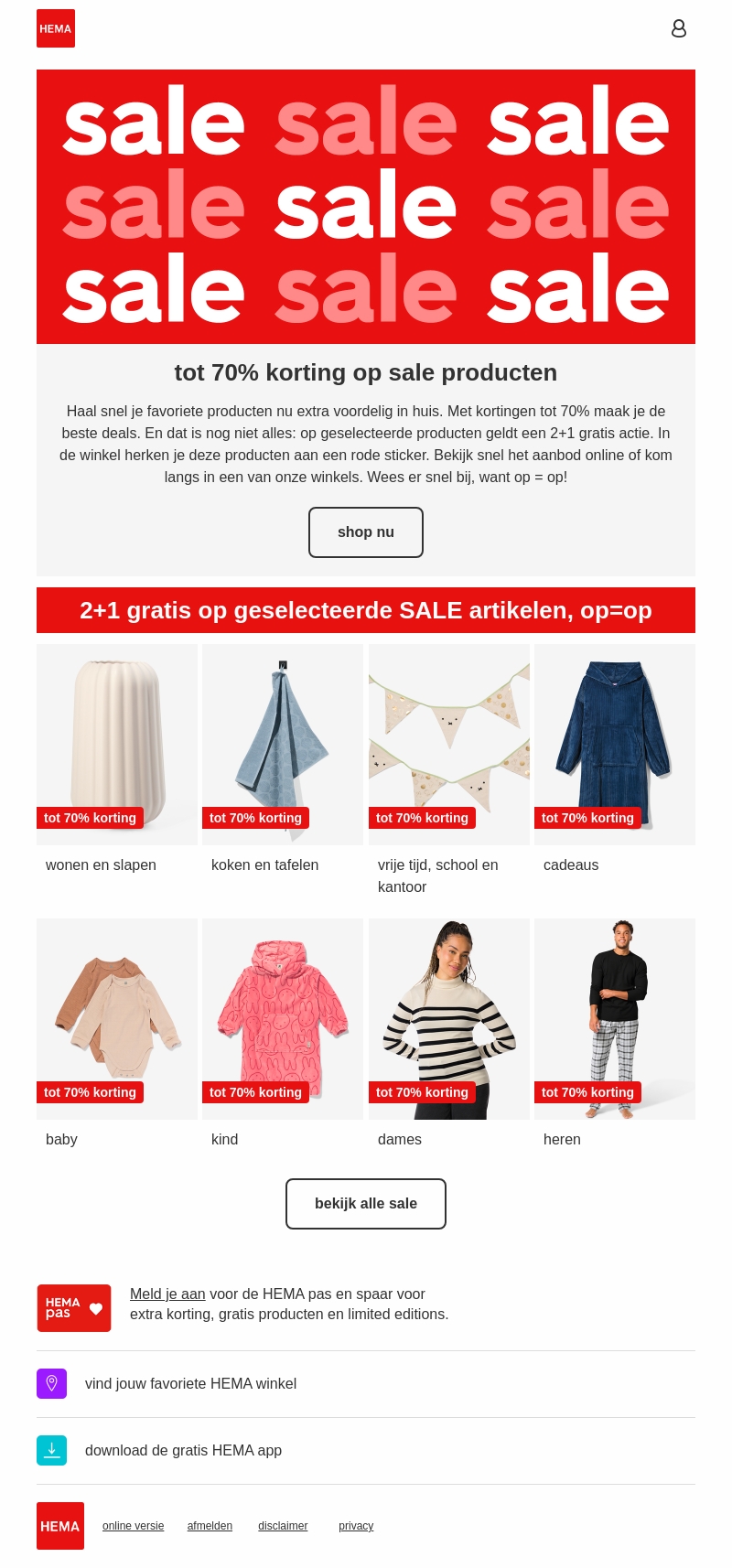 HEMA biedt nu kortingen tot 70% op een breed scala aan producten. Daarnaast geldt er een 2+1 gratis actie op geselecteerde artikelen. Deze aanbiedingen zijn te herkennen aan een rood sticker in de winkel. Bezoek snel online of een van de HEMA winkels om te profiteren van deze deals.