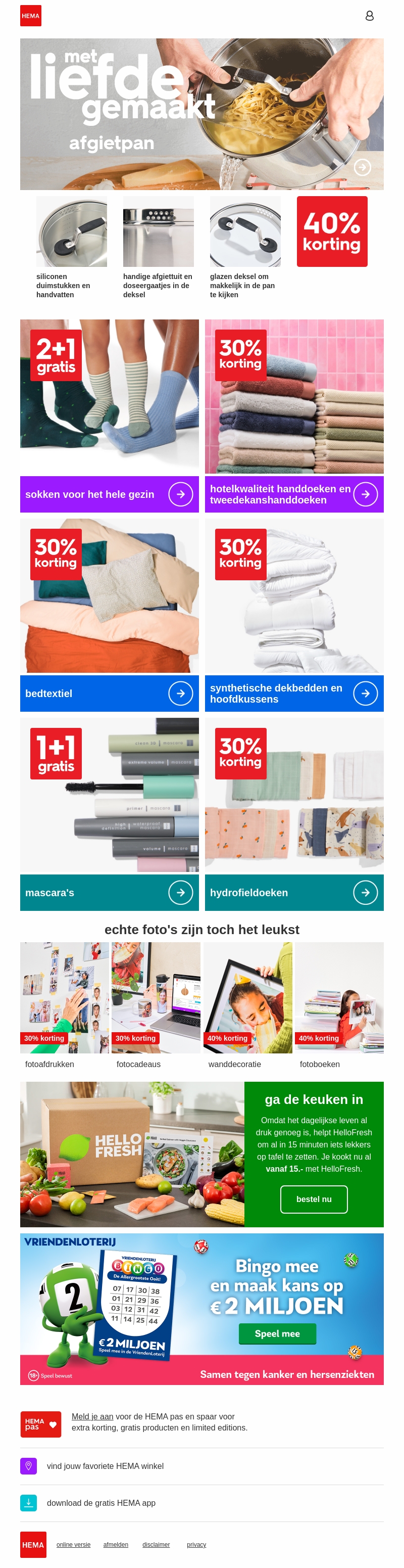 Deze week biedt HEMA geweldige kortingen op een breed scala aan producten. Geniet van 40% korting op Milano en Napoli pannen, 30% korting op bedtextiel en fotoproducten. Mis ook de 1+1 gratis aanbiedingen op sokken niet! Verwen jezelf met topkwaliteit producten voor minder.