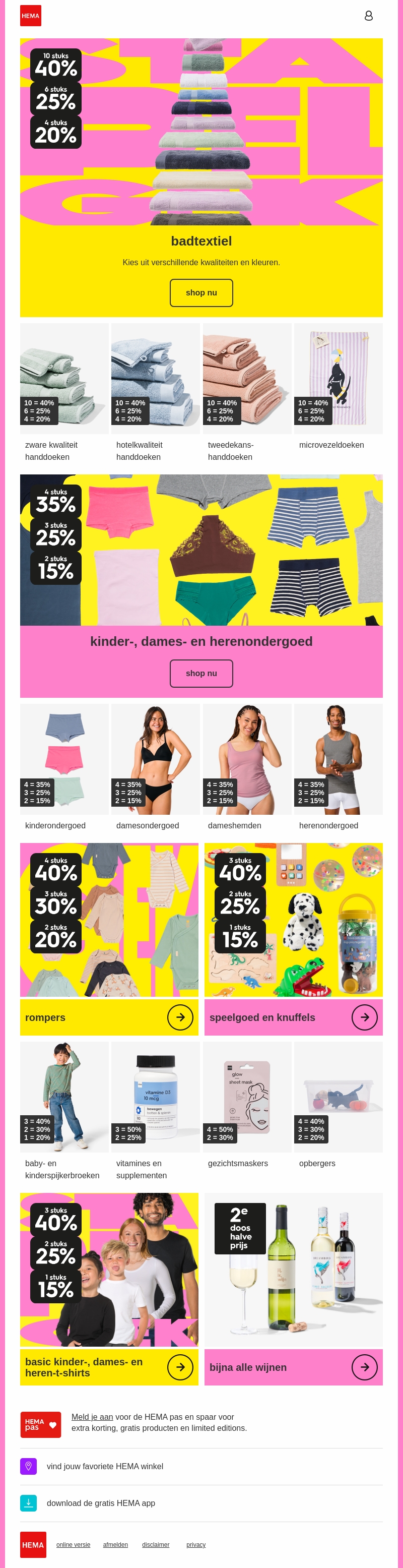 Profiteer van geweldige kortingen deze week bij HEMA! Ontvang tot wel 40% korting bij de aanschaf van 10 stuks badtextiel en 35% korting op ondergoed. Er zijn ook andere fantastische aanbiedingen op rompers, speelgoed, t-shirts en meer. Mis deze geweldige deals niet, shop nu!