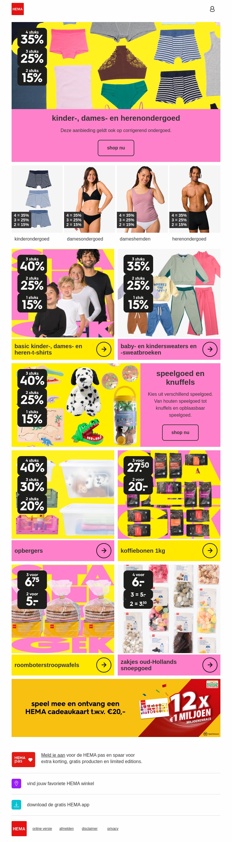 Profiteer van tot wel 35% korting op een breed assortiment kinder-, dames- en herenondergoed. Of je nu op zoek bent naar comfortabele kinderondergoed, stijlvolle damesondergoed of praktische herenondergoed, HEMA heeft het allemaal. Mis ook de speciale aanbiedingen op basis t-shirts en sweaters niet. Shop nu en bespaar groot!