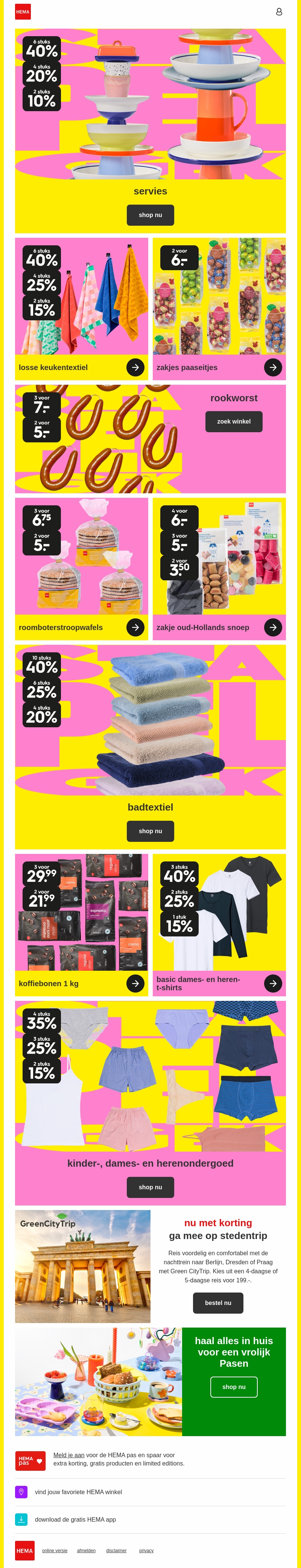 HEMA biedt nu stapelgekke aanbiedingen met kortingen tot 40% op een breed scala aan producten. Van servies en keukenaccessoires tot textiel en snoep, er is voor ieder wat wils. Ontdek de kleurrijke selectie en profiteer van deze geweldige prijzen. Mis het niet en shop meteen voor uw favoriete items.