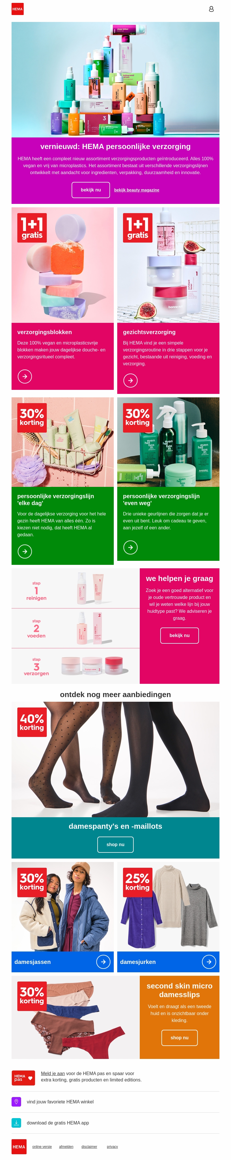 HEMA introduceert een complete lijn persoonlijke verzorgingsproducten. Profiteer nu van de 1+1 gratis aanbieding op gezichtsverzorging. Daarnaast zijn er aanbiedingen zoals 30% korting op dagelijkse verzorging. Mis de kans niet om jouw verzorgingsroutine te vernieuwen met duurzame en innovatieve producten.