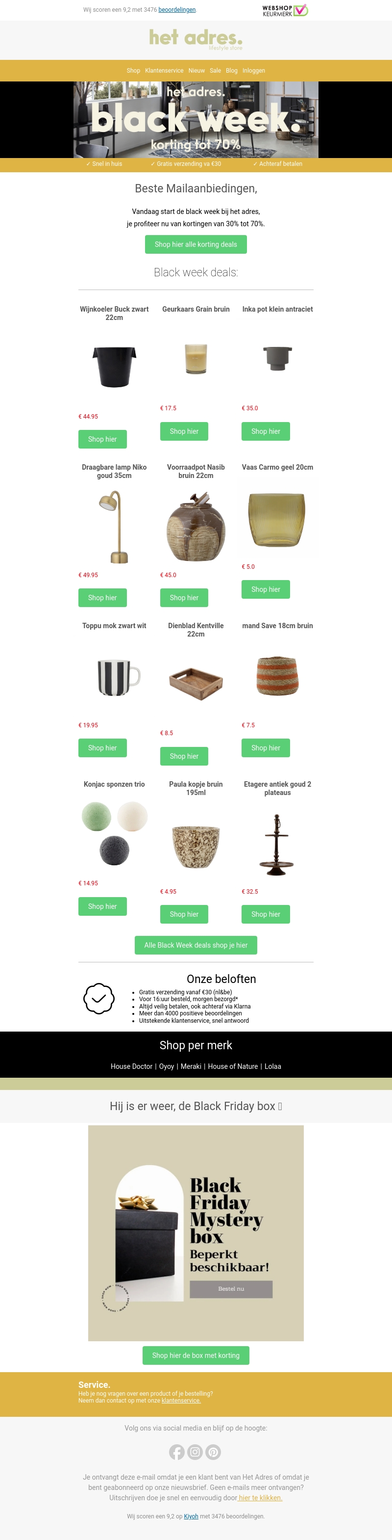 Het is Black Week bij het adres, met kortingen van 30% tot 70% op diverse producten. Shop direct om te profiteren van deze geweldige deals. Van wijnkoelers tot interieuraccessoires, er is voor ieder wat wils. Gratis verzending vanaf €30 en achteraf betalen mogelijk. Grijp je kans voordat je favoriete items zijn uitverkocht!