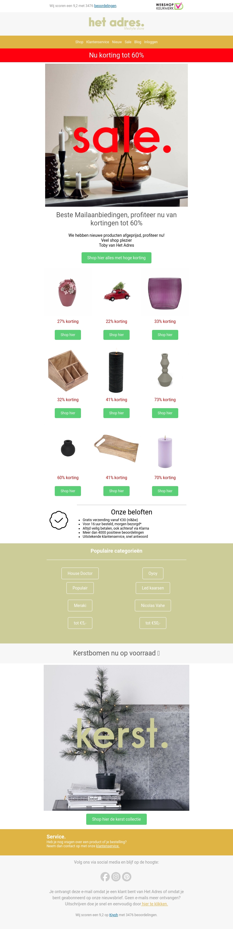 Bij Het Adres vind je nu aantrekkelijke herfstkortingen tot 60%. Ontdek het ruime aanbod aan stijlvolle decoratieve items. Van vazen tot unieke kerstproducten, er is voor ieder wat wils. Shop snel voordat de aanbiedingen voorbij zijn. Bekijk de nieuwste collectie online en bespaar flink. Mis deze kans niet op exclusieve aanbiedingen.