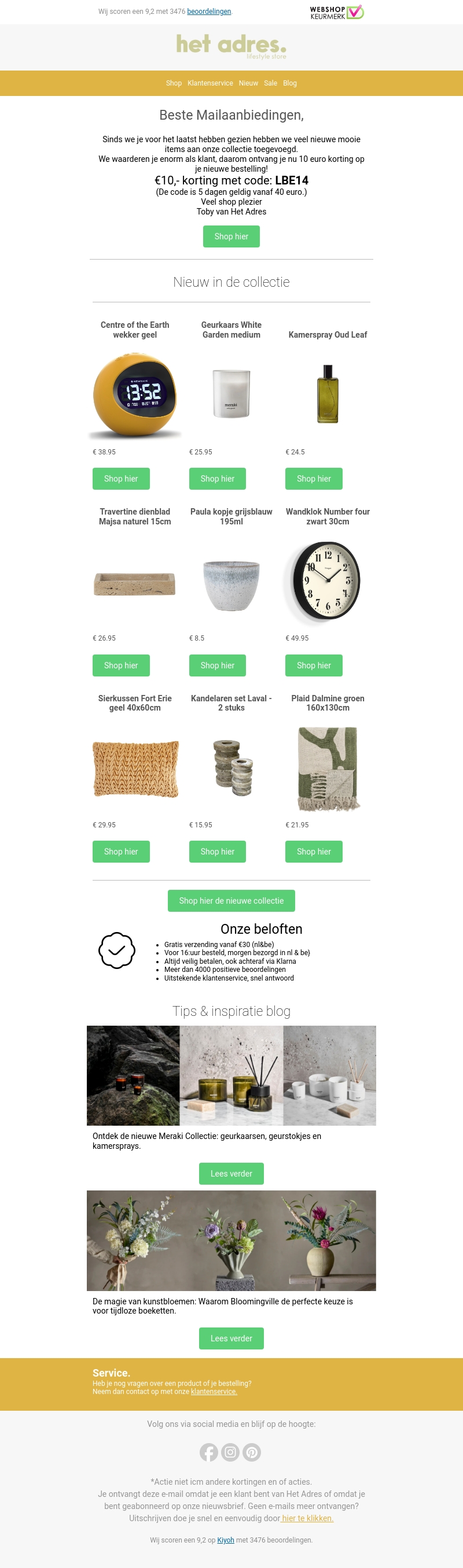 Bij Het Adres waarderen we je als klant enorm. Daarom krijg je €10 korting op je volgende bestelling. Ontdek onze nieuwste collectie met stijlvolle items zoals klokken, kandelaren en plaids. Geniet van gratis verzending vanaf €30. Mis deze kans niet en shop vandaag nog!