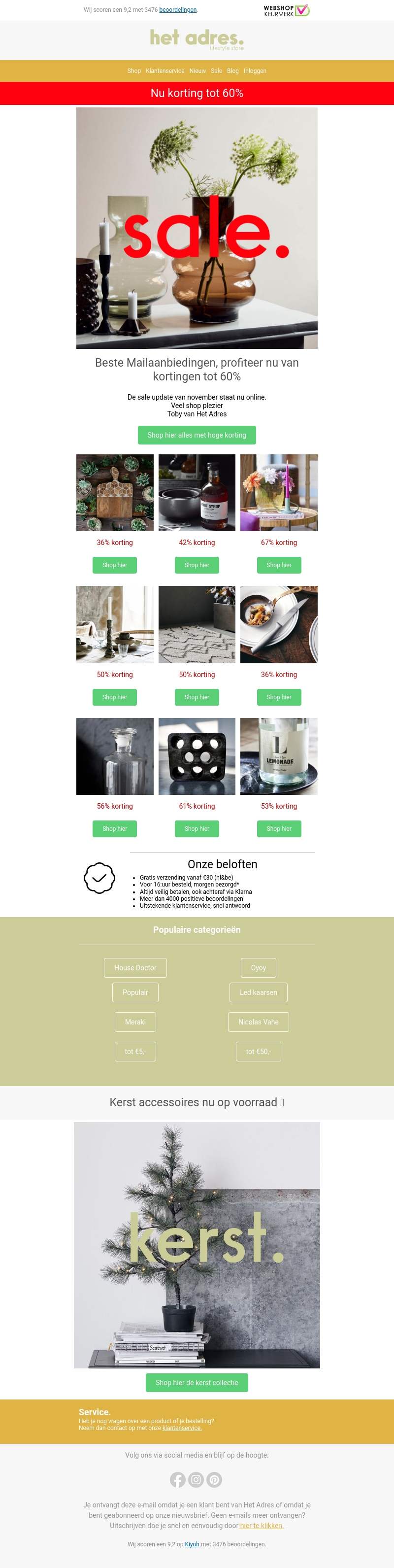 De nieuwste November Sale is nu beschikbaar met kortingen tot wel 60% op een breed scala aan producten. Profiteer van uitzonderlijke deals op decoratie, keukenartikelen en meer. Mis deze kans niet om je favoriete items tegen een gereduceerde prijs te kopen. Gratis verzending vanaf β¬50 en snelle levering gegarandeerd. Bekijk nu de volledige sale en de kerstcollectie online.