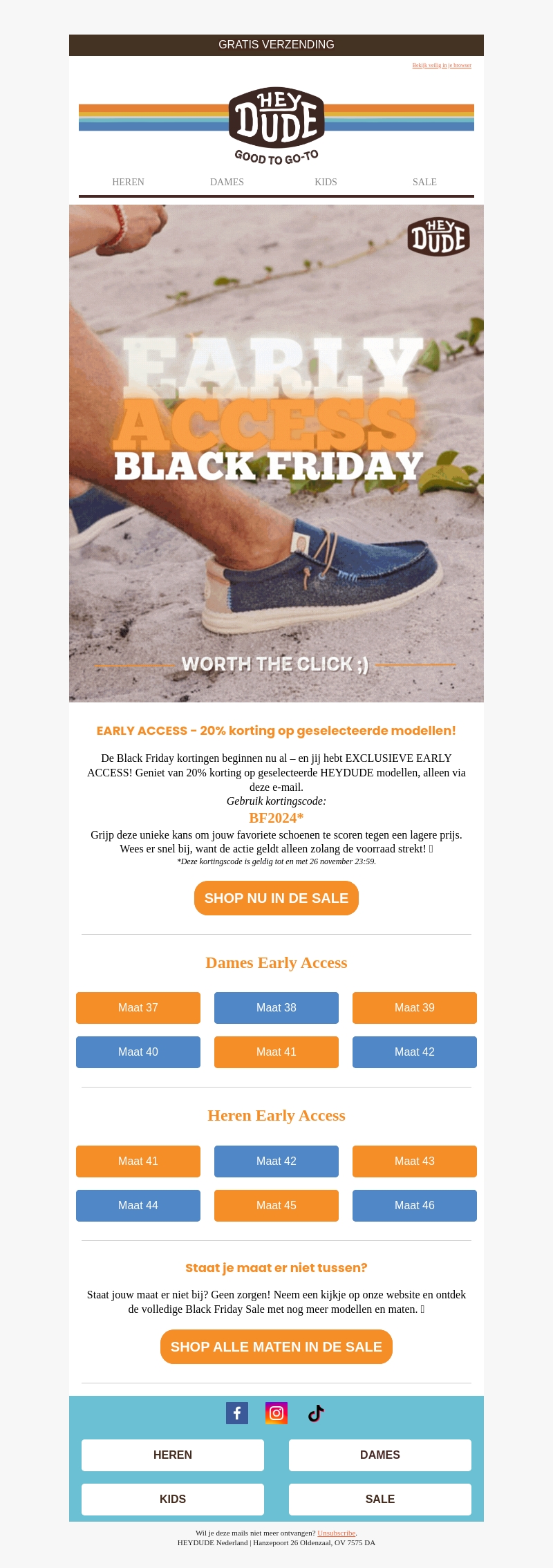 De Black Friday aanbiedingen starten vroeg! Profiteer nu van een exclusieve 20% korting op geselecteerde HEYDUDE modellen met onze vroegtijdige toegang tot de uitverkoop. Wees er snel bij, want de voorraad is beperkt. Gebruik de kortingscode en ontdek geweldige deals voor dames en heren. Mis het niet!