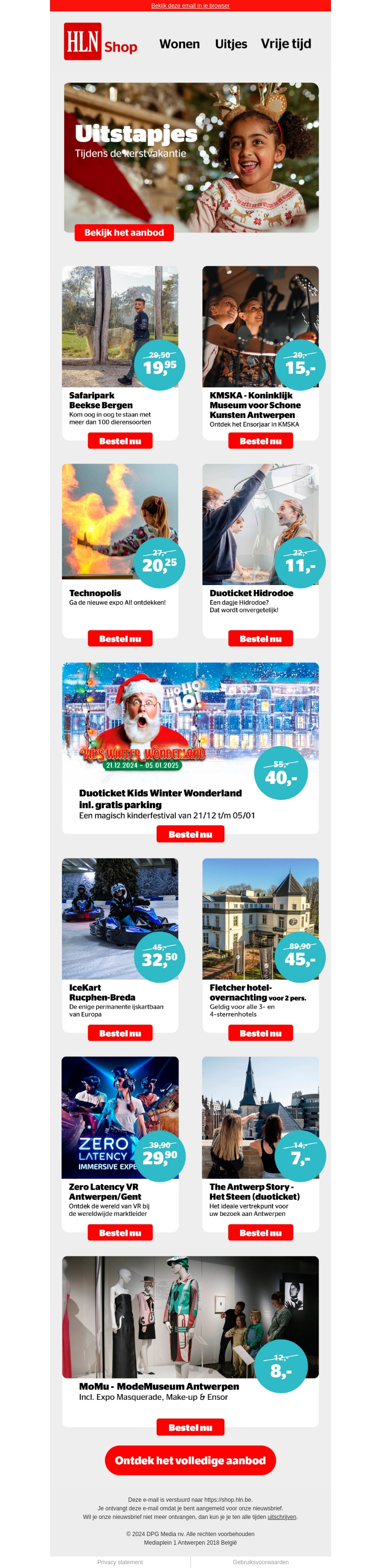 Maak van deze kerstvakantie een magisch avontuur met HLN Shop. Verken spannende locaties zoals het Safaripark Beekse Bergen en het Museum voor Schone Kunsten. Bezoek fascinerende exposities bij Technopolis en beleef een unieke VR-ervaring. Geniet van winterse wonderland attracties en rust heerlijk uit in onze geselecteerde hotels. Bekijk nu ons volledige aanbod en plan jouw perfecte uitje.