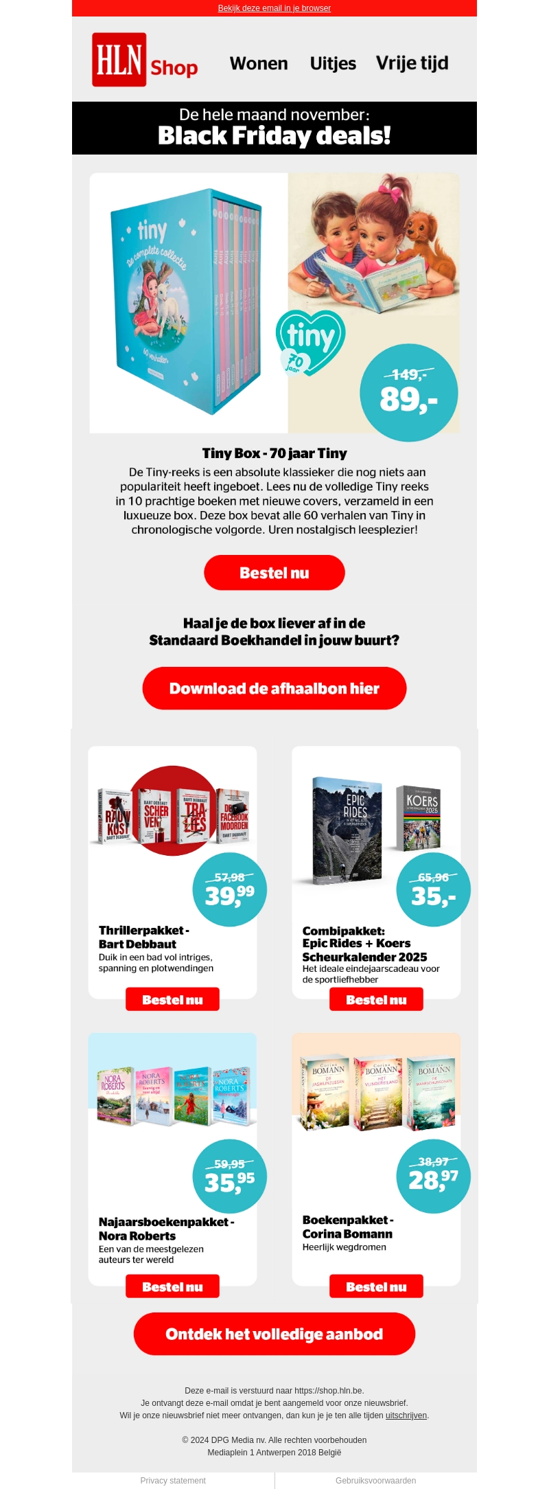 De Tiny-reeks is nu compleet verkrijgbaar in een luxueuze verzamelbox. Profiteer van bijzondere Black Friday deals voor de hele maand november. Naast de Tiny box zijn er spannende aanbiedingen zoals het thrillerpakket van Bart Debbaut en het combipakket met de Epic Rides scheurkalender 2025. Voor de romanceliefhebbers zijn er aantrekkelijke pakketten van Nora Roberts en Corina Bomann.
