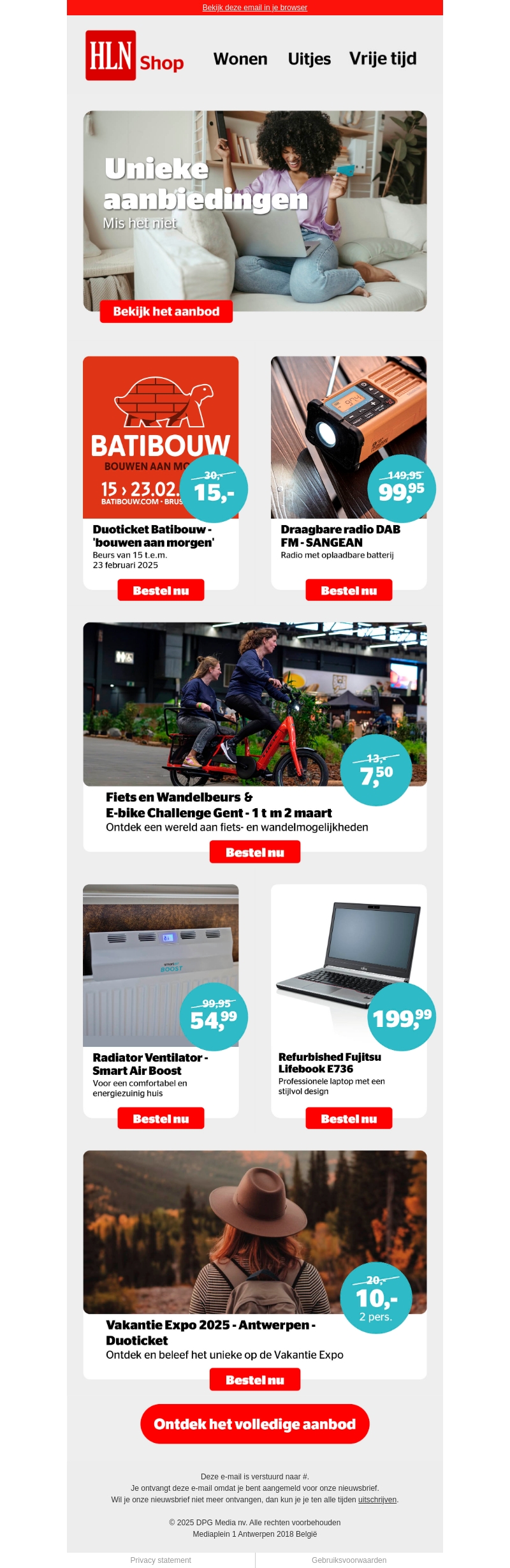 Ontvang exclusieve kortingen en unieke aanbiedingen van HLN Shop. Van Duotickets voor Batibouw tot draagbare radio's en fietsuitjes. Mis deze prijsverlagingen en evenementen niet! Ontdek het gemak van de Radiator Ventilator of een refurbished laptop. Schrijf je in voor de Vakantie Expo 2025.