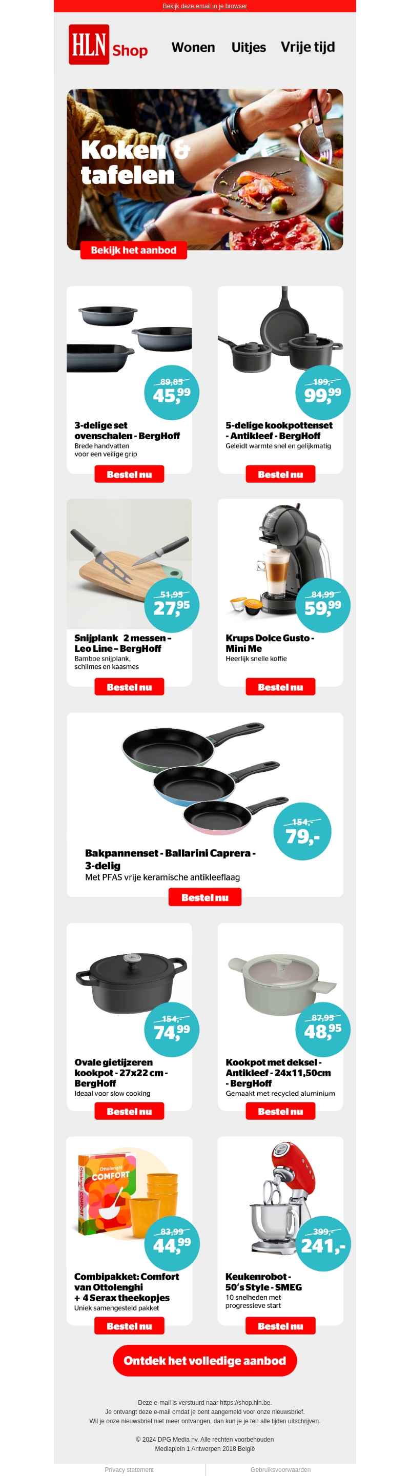 Maak van je keuken een culinaire hotspot met exclusieve kortingen op topmerken zoals BergHoff en SMEG. Ontdek de 3-delige ovenschalenset, de snelle Krups Dolce Gusto koffiemachine en meer. Geniet van stijlvolle en functionele keukenaccessoires die elke maaltijd bijzonder maken. Mis deze kans niet om je kookgerei te vernieuwen en te genieten van kortingen tot wel 50%.