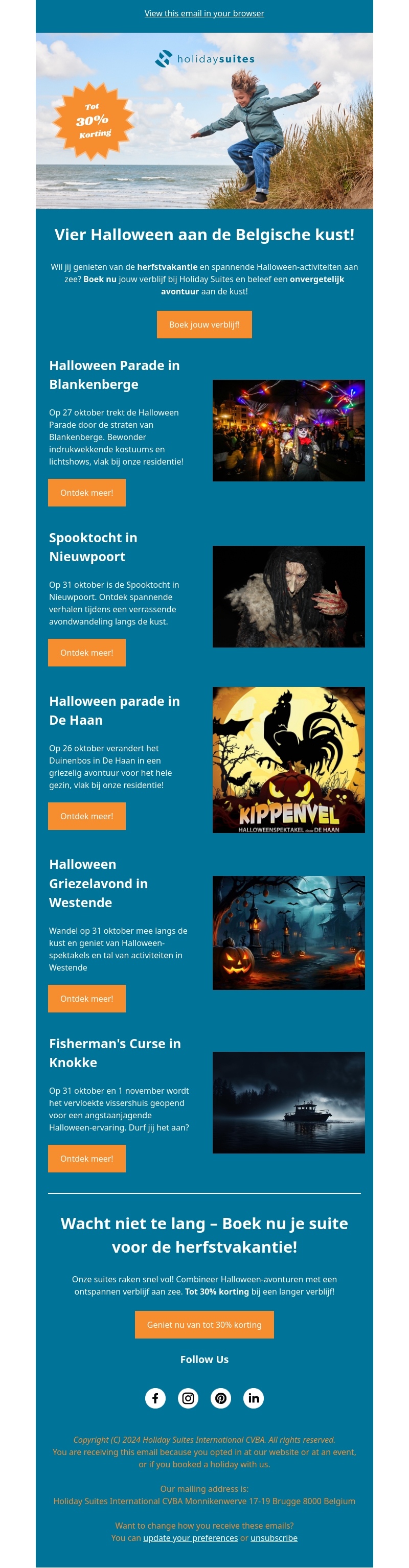 Ervaar Halloween aan de Belgische kust met spectaculaire parades en spannende avonden. Boek vรณรณr de herfstvakantie bij Holiday Suites en ontvang tot 30% korting op je verblijf. Mis de kans niet voor een onvergetelijk avontuur aan de kust.