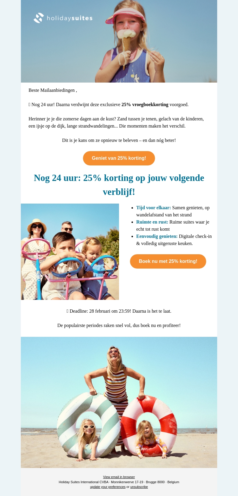 Geniet van 25% korting op je volgende verblijf bij Holiday Suites. Herbeleef de zomerse dagen aan de kust met je gezin en profiteer van de exclusieve vroege boekingskorting. De aanbieding is slechts 24 uur geldig, dus boek snel voor de deadline op 28 februari 23:59 uur. Mis deze kans niet om te ontspannen en plezier te maken. Reserveer nu en zorg ervoor dat je favoriete periode nog beschikbaar is!
