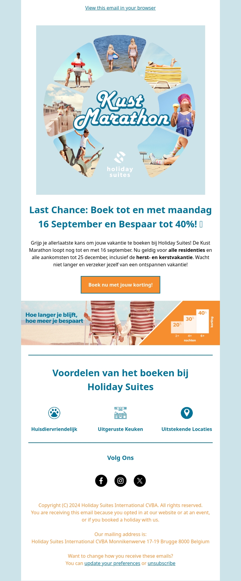 Grijp je allerlaatste kans om jouw vakantie te boeken bij Holiday Suites. De Kust Marathon loopt nog tot en met 16 september. Nu geldig voor alle residenties en aankomsten tot 25 december, inclusief de herfst- en kerstvakantie. Wacht niet langer en verzeker jezelf van een ontspannen vakantie!