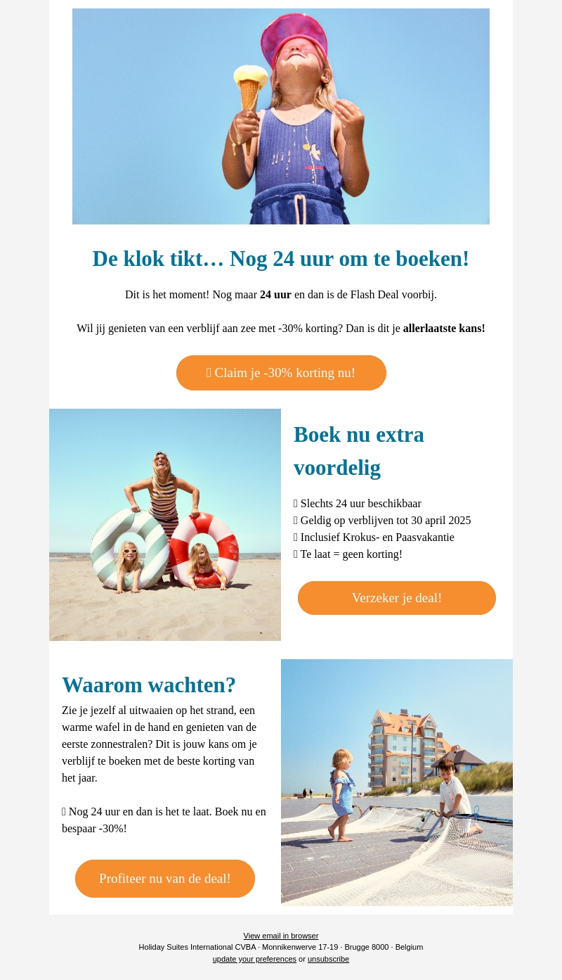 Dit is je allerlaatste kans om te genieten van een verblijf aan zee met 30% korting. Deze aanbieding is slechts 24 uur beschikbaar en geldt tot 30 april 2025. Inclusief Krokus- en Paasvakantie! Boek nu en bespaar.