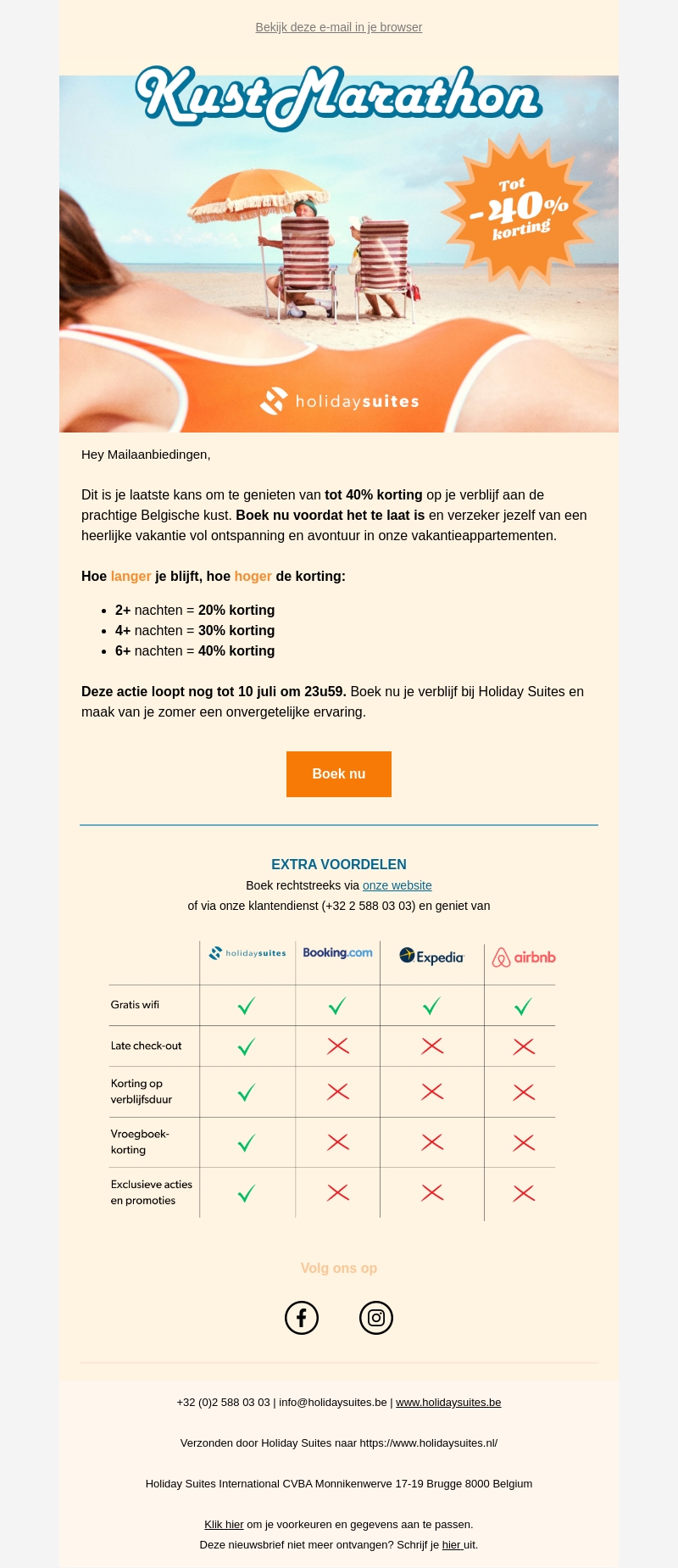 Dit is je laatste kans om te genieten van tot 40% korting op je verblijf aan de prachtige Belgische kust. Hoe langer je blijft, hoe hoger de korting. Actie geldig tot 10 juli om 23u59. Boek nu voor een onvergetelijke zomervakantie bij Holiday Suites.