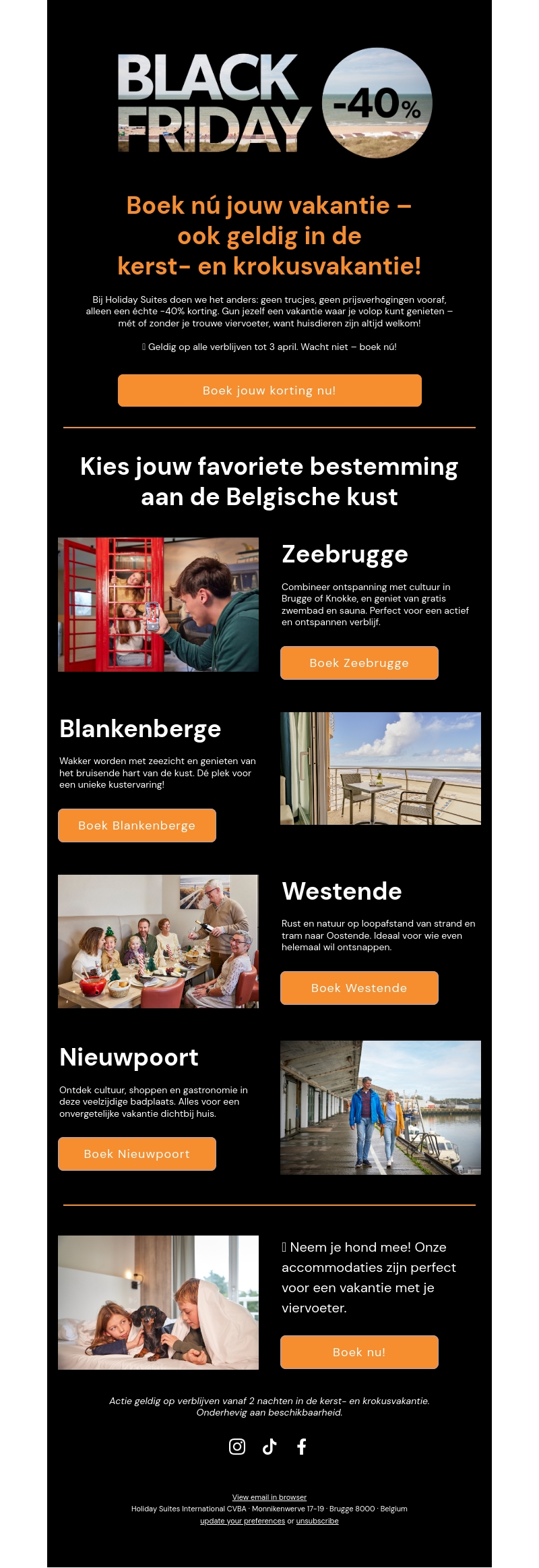 Ontdek de beste vakantiedeals met onze Black Friday aanbiedingen. Boek nu je verblijf aan de Belgische kust en geniet van 40% korting. Kies uit bestemmingen zoals Zeebrugge, Blankenberge, Westende en Nieuwpoort. Verblijf 2 nachten of meer tijdens de kerst- en krokusvakantie. Huisdieren zijn welkom!