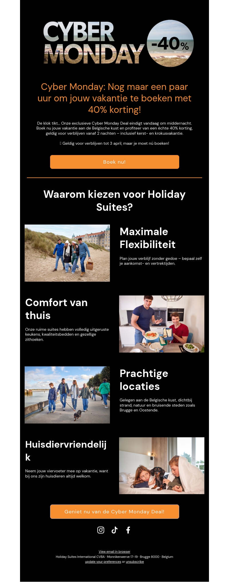 Profiteer van de exclusieve Cyber Monday Deal met 40% korting op een vakantie aan de Belgische kust. Boek voor middernacht en geniet van een luxe verblijf, huisdiervriendelijkheid, en comfortabele suites. Geniet van maximale flexibiliteit en prachtige locaties voor jouw ideale uitje.