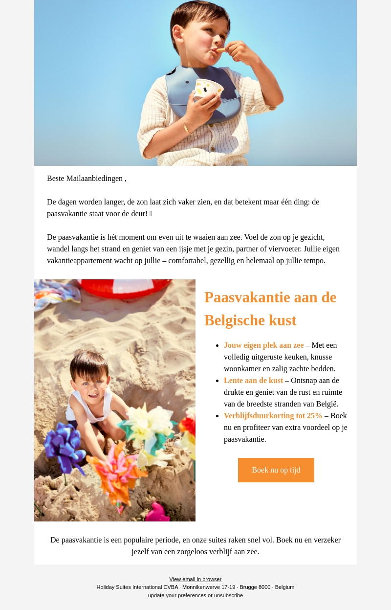 Vier Pasen aan de Belgische kust met Holiday Suites. Geniet van comfortabele appartementen vlakbij het strand. Ontsnap aan de drukte en maak gebruik van de verblijfsduurkorting tot 25% voor extra voordeel. Boek snel je zorgeloze vakantie.