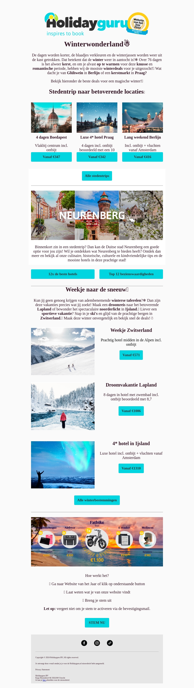 Ontsnap aan de dagelijkse sleur en ervaar een magische winter met onze exclusieve winteraanbiedingen. Bezoek steden zoals Boedapest en Berlijn, of kies voor een sneeuwavontuur in Lapland of IJsland. Bekijk onze deals voor een onvergetelijke winterreis. Of je nu ontspanning of een actieve vakantie zoekt, wij hebben voor ieder wat wils.