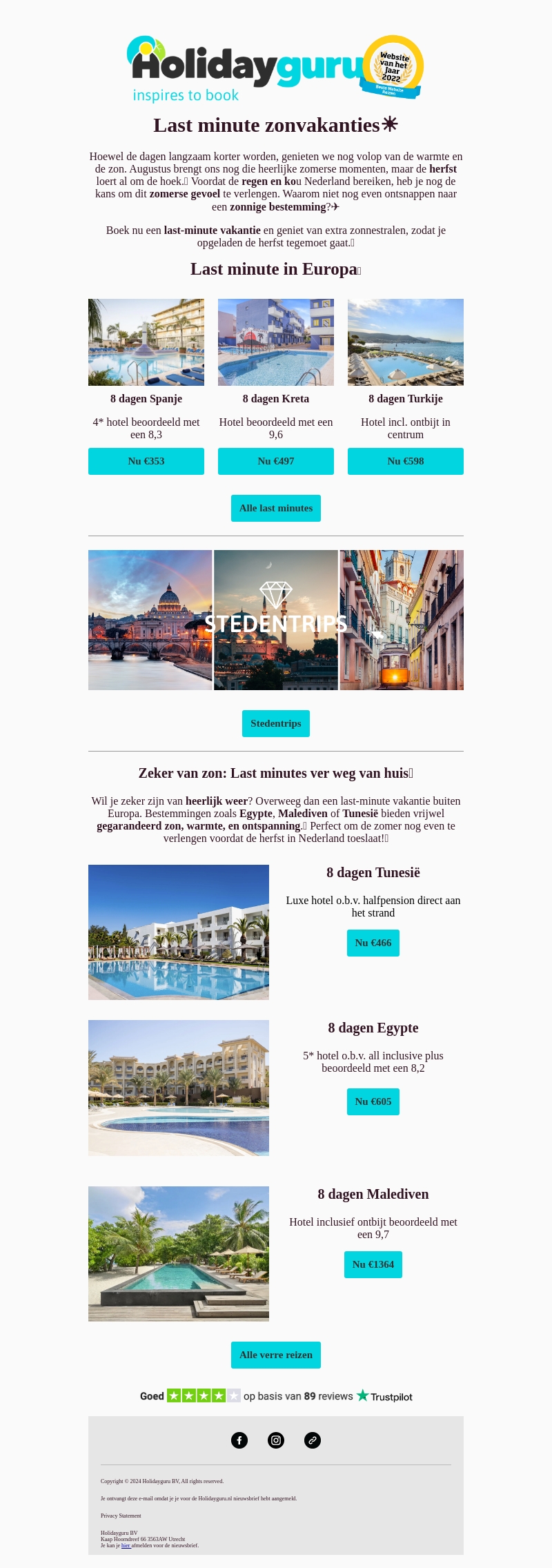 Hoewel de dagen korter worden, zijn er nog genoeg mogelijkheden om te genieten van de zon met onze last-minute deals. Boek nu een vakantie in Europa of verder weg en verleng dat zomerse gevoel. Kies uit bestemmingen zoals Spanje, Kreta, Turkije, Egypte, en de Malediven.