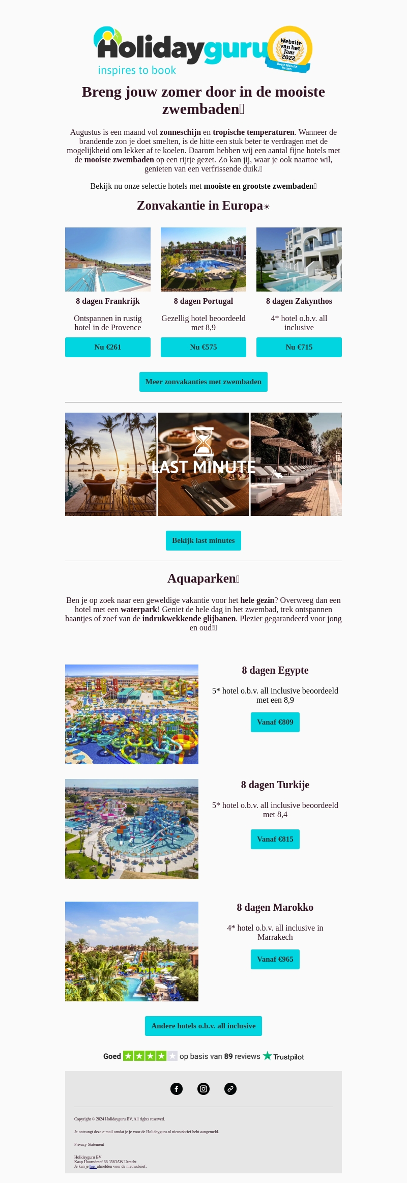 Augustus is de maand van zonneschijn en tropische temperaturen. Bekijk onze selectie van hotels met de mooiste zwembaden om een verfrissende duik te nemen. Geniet van een zonvakantie in Europa of bezoek aquaparken voor een avontuur voor het hele gezin met indrukwekkende glijbanen en waterparken.