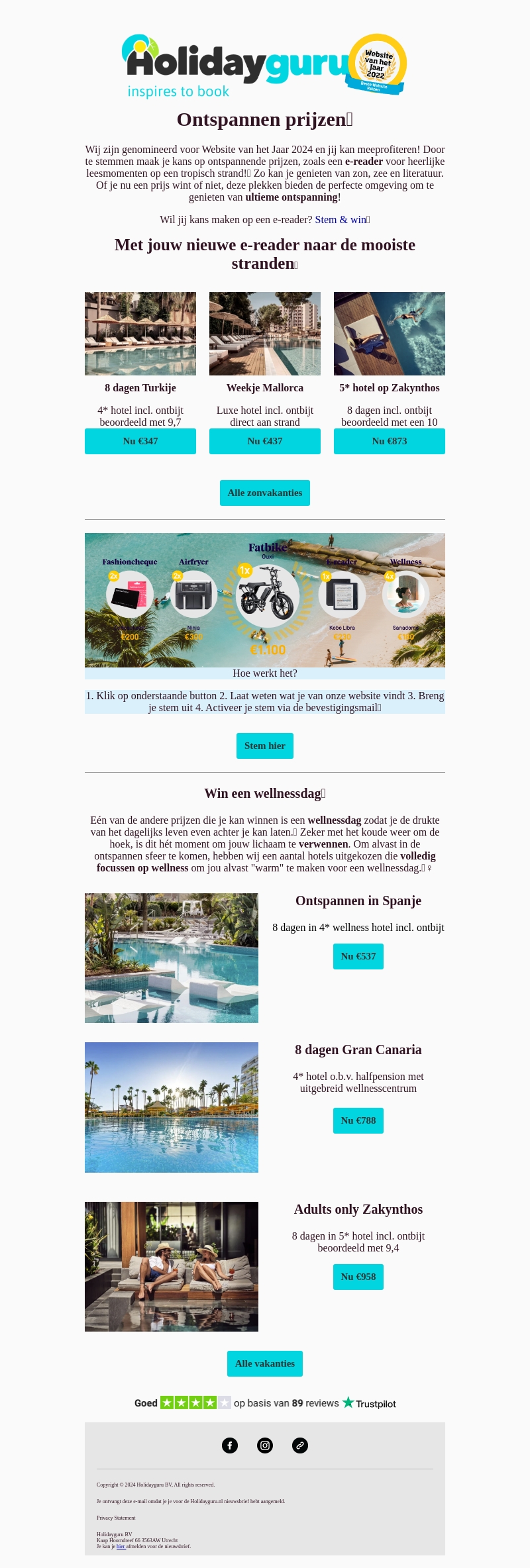 Holidayguru heeft spannende prijzen voor jou! Stem nu en maak kans op een ontspannen dag aan het strand of een luxe wellnessdag. Profiteer van onze aanbiedingen voor Turkije, Mallorca, Zakynthos, en meer. Stem en win een e-reader, wellnessdag of andere geweldige prijzen. Ontdek jouw droomvakantie vandaag nog!